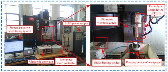 The C-ELID and UVA-ELID grinding tests were performed on a three-axial machining center (VMC850E, SMTCL, Shenyang, China). As shown in Figure 4, the experimental setup included the ELID power supply, electron discharge machining (EDM) dressing device, ultrasonic vibration system, the sharp electrolytic device, and processing parameter monitoring system. The ELID power supply was mainly used to provide the energy for the processing and regulate electrical parameters. The EDM dressing device was fixed on the left side of the worktable for dressing the grinding wheel. The electrolytic sharp device and the ultrasonic vibration system were fixed on the spindle using a clamp.