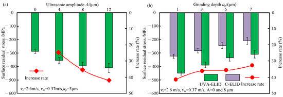 Effect of parameters on the surface residual stress (a) Ultrasonic amplitude (b) Grinding depth.