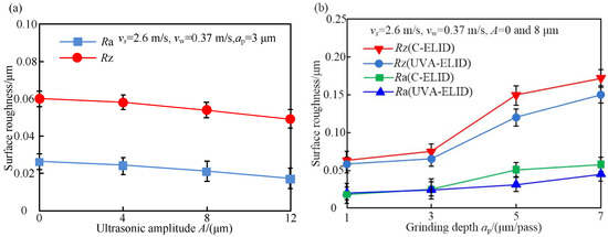 The effect of parameters on the surface roughness during both processing is shown in Figure 6. As can be seen from Figure 6a,b, the surface roughness (Ra and Rz) decreased with the increase in ultrasonic amplitude but increased with the grinding depth. It was attributed to the fact that the increase in ultrasonic amplitude strengthened the interference between the grain trajectories and led to more material removal. The surface roughness Ra and Rz decreased by 14.5% and 20.6%, respectively, with grinding depth during the UVA-ELID compared with the C-ELID grinding. The surface roughness was enhanced obviously with the grinding depth in the range of 3–5 μm, including the critical grinding depth, while it displayed a linear increase when the grinding depth was below this range. This indicated that the material removal changed within the scope of grinding depth. When the grinding depth exceeded this range, the variation in roughness was not obvious. This was the reason that the higher instantaneous impact under ultrasonic vibration acted on the surface and led to a dramatic change in micro-topography. Compared with the instantaneous impact force, the average acting force on the surface was smaller. It resulted in a decrease in surface roughness (Ra), and the quality was improved.