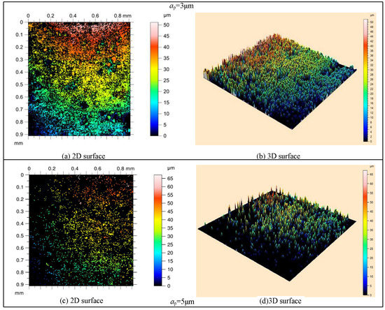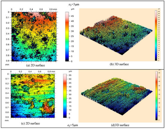 The surface morphology under different processing parameters is presented in Figure 9. The grooves on the surface of C-ELID were obviously presented on the machined surface when the grinding depth was less than 3 μm. It demonstrated that the materials were mainly removed by plastic deformation. As shown in Figure 9, when the grinding depth was 5 μm, the surface quality gradually deteriorated with the appearance of plowing ridges. With an increase in grinding depth, the plowing ridges were obvious on the surface, with some fractures. In contrast, the UVA-ELID could change the mode of material removal; even at the larger grinding depth, the ductile remove took place, which improved the surface quality to a certain extent. It was attributed to the fact that the effect ultrasonic vibration could change the characteristic of the nanocomposite ceramic. When the grain impacted the surface with a higher ultrasonic amplitude, the microhardness of the workpiece changed. That is to say, the internal vibration stress generated from ultrasonic vibration offset some of the existing internal stress, which was also called equivalent hardness. The large internal vibration stress led to an obvious decrease in equivalent hardness and softened the surface layer [20]. Therefore, the softening effect of ultrasonic vibration during UVA-ELID prompted material removal and achieved a higher quality.