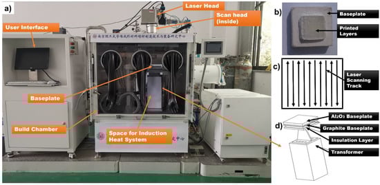 (a) Experimental setup. (b) Printed layers of ceramic specimen. (c) Laser scanning strategy. (d) Schematic of induction heating system.