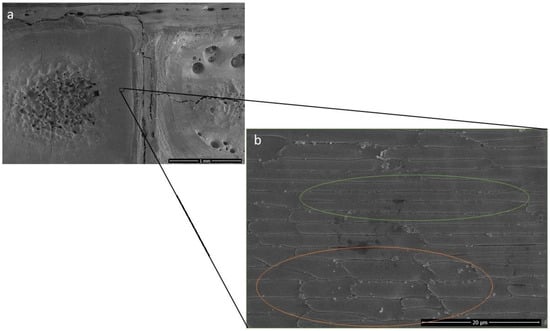 When SiC content increases in Al2O3, the tendency of the chemical reaction increases. As described in Equations (1)–(3), the interaction of Al2O3 and SiC will ultimately generate the high porosity within the article manufactured by PBSLP. In Figure 4c, the high porosity was seen in the middle of the track (when the laser power was increased to 140 W with the composition of the 90 wt% Al2O3 and 10 wt% of SiC). However, near the edges of the track of the same article, it can be seen that the additive manufacturing and reaction conditions are entirely different because they show high quality and multi-directional grains of the ceramic article.
