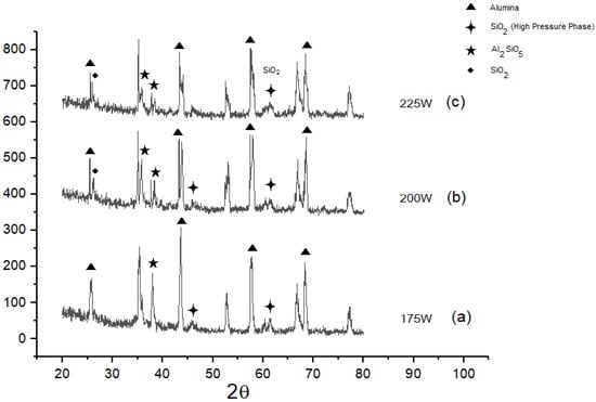 Laser irradiation is very rapid, and it may also involve the Si sublimation similar to that of high-temperature annealing of SiC, which may leave a carbon-rich surface where mobile C atoms are in abundance []. However, as the experiments are conducted in open air, the increase in chemical interaction between SiC and Al2O3 by varying the laser power or energy density can be analysed in XRD profile changes in Figure 6a–c. The experiments are conducted in open air, which may lead to chemical oxidation of SiO mentioned in Equation (1) into SiO2. Similarly, Al2SiO5 phase in XRD could be due to the formation of an intermediate phase of SiO2 and Al2O3, which is also decreasing with the increase in laser power.