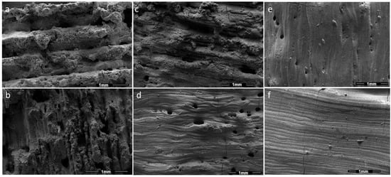 When the laser scan line during PBSLP encounters SiC in bulk or more than usual (as compared to the rest of the material mixture powder layer), it can leave that part un-melted (as the mixing is random), leading to pores clearly showing un-melted morphology on the surface, which can be seen in Figure 8d,e. Even though the melting temperature was higher due to the relatively large amount of SiC in Figure 8a–c, this phenomenon was more abundant within the sintered articles.
