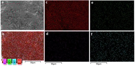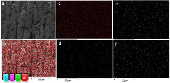 (a) Alumina wt% 99.5, silicon carbide wt% 0.5 at 160 W laser power. (b) EDS map of Si, C, O and Al; (c) EDS map of Al; (d) EDS map of C; (e) EDS map of C; and (f) EDS map of Si of the same article.
