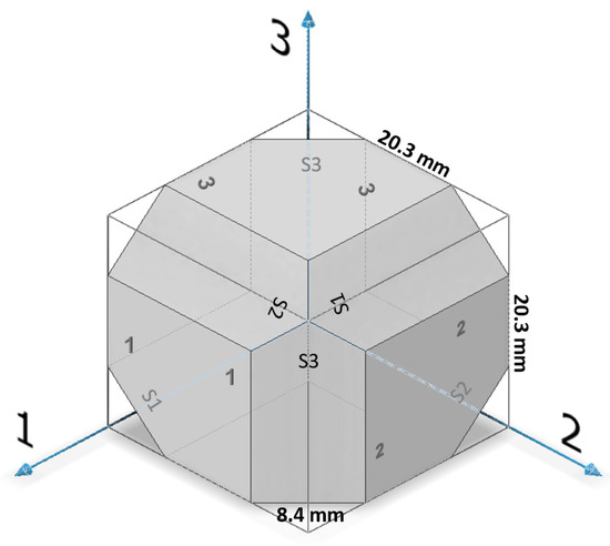 - A parallelogram sample, 30 mm × 30 mm× 25 mm in dimensions, was machined from a rod manufactured by EBM at the AM Center of Rotem Industries Ltd. (Mishor Yamin, Israel) using an Arcam Q20 Plus EBM machine (Arcam AB, Gothenburg, Sweden) and a Ti6Al4V Grade 5 spherical powder with a size distribution of 45–106 μm [38,39,40]. Rod specimens 11 mm in diameter were orientated on the XY plane of the tray. Printing parameters were set to accelerating voltage of 60 kV, beam current of 28 mA, speed function of 32 (∼2400 mm/s base beam speed), and layer thickness of 90 μm. The temperature was maintained in the range of 750–850 °C. A chamber pressure of 4 × 10−3 mbar was regulated utilizing a helium leak valve [40]. The chemical composition (wt.%) of the as-printed alloy was 88.5 Ti, 7.7 Al, 3.8 V, 0.1352 O, 0.0066 C, 0.0052 N, and 0.0036 H [40].