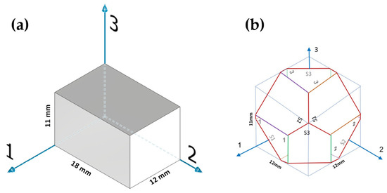 - A parallelogram sample, 16 mm × 26 mm × 12 mm in dimensions, was machined from a cut piece of a fitting DED with a LENS MR-7 (Omega) system by Optomec, Inc. (Albuquerque, NM, USA) [7]. The fitting was printed using a Ti6Al4V Grade 5 spherical powder with a particle size range of 44–149 µm. Deposition was carried out using a standard head, laser power of 450 W, PMFR of 3.78 g/min, travel speed of 63.5 cm/min, and layer thickness of 381 μm. The travel speed was the same for both contour and hatch. The deposition strategy was 0, 90, 180, and 270 degrees sequentially per layer with a hatch spacing of 0.508 mm [7]. The chemical composition of this alloy (wt.%) was 89.37 Ti, 6.28 Al, 3.74 V, 0.395 Fe, 0.07 Mo, 0.05 Nb, 0.045 Cr, 0.024 Ni, 0.019 Si, and 0.009 C (the O, N, and H concentrations were not measured) [7].