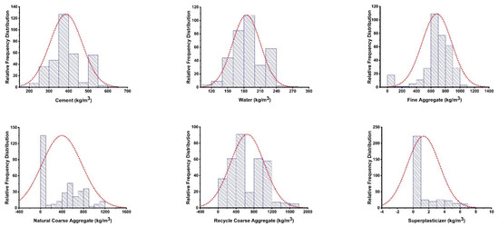 The model’s performance is based on the input variables and the number of databases used to run the model. The parameters used in this study for running the models to predict the CS and STS of RCA-based concrete were taken from the published literature and are available in Appendix A [27]. The anaconda navigator software was used in this research and incorporated Python coding to run the models for forecasting the results. The excel file with relevant input and output data was uploaded to the software, which runs the model as per the data available in the file. The outcome from the model was then imported for graphical representation. The running of the models comprised nine input parameters (cement, water, fine aggregate, natural CA, RCA, superplasticizers, maximum size of RCA, density of RCA, water absorption of RCA) and two output parameters (CS and STS). The relative frequency distribution of the nine variables can be seen in Figure 1. The relevant references regarding the application of various ML approaches are listed in Table 1. The descriptive statistical analysis for input parameters is illustrated in Table 2, indicating the various mathematical description and ranges of input parameters. In addition, the methodology of the research approach is presented via flowchart, as depicted in Figure 2, which represents the information of the stepwise adopted procedure of the study. The first phase indicates the information of the data obtained, and then the analysis took place using machine learning algorithms, while result explanation, comparison, and evaluation are presented in the next step of the flowchart.
