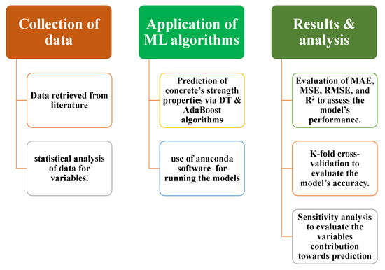 The focus of this research is based on the prediction of two properties (STS and CS) of concrete containing RCA via supervised ML algorithms [25]. The performance of both models was analyzed and compared to evaluate the better performer for the prediction of results. The accuracy level between the real and anticipated output was observed from the coefficient correlation (R2) value, and a higher value gives the impressive performance of the employed model. The AdaBoost technique was employed for optimization via producing 20 sub-models to obtain a higher R2 value [26]. The application of these ML algorithms is to compare the predictive evaluation of each approach. The significance of this study is to determine the effect of the input factors used to anticipate the mechanical characteristics of concrete and the predictive accuracy of both methodologies. The research is innovative in that it uses the type of ML techniques and individual (DT) and ensemble (AdaBoost) ML algorithms to forecast the two outcomes (CS, STS) of recycled coarse aggregate concrete (RCA). The statistical application of checks was applied to analyze the nature of both techniques. In addition, the sensitivity analysis was also incorporated, which indicates the performance level of each input parameter for the anticipation of both STS and CS.