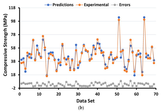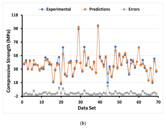 The relationship between the actual and predicted result of compressive strength for the decision tree algorithm can be seen in Figure 3a, along with the distribution of the errors shown in Figure 3b. The errors distribution for DT gives the maximum, minimum, and average values equal to 8.82 MPa, 0.58 MPa, and 3.58 MPa, respectively. However, 11.59% of the error data lie between 0 and 1 MPa, and 50.72% of the data lie between 2 MPa and 6 MPa. In addition, only 8.69% of the data lie above 7 MPa.