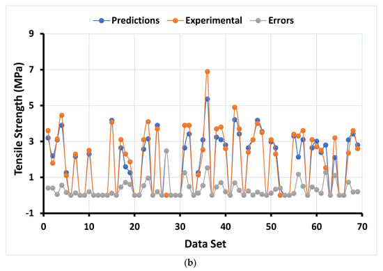 AdaBoost regressor gives strong relation between the real and anticipated output, as shown in Figure 5a, while the distribution of the error’s value can be seen in Figure 5b. It shows the maximum, lower, and average values of the error data equal to 13 MPa, 0.06 MPa, and 2.33 MPa, respectively. Additionally, 26.08% of the error data were reported between 0 and 1 MPa, while 34.78% of the data lie between 2 MPa and 6 MPa. However, 4.34% of the error data were reported to be above 7 MPa.