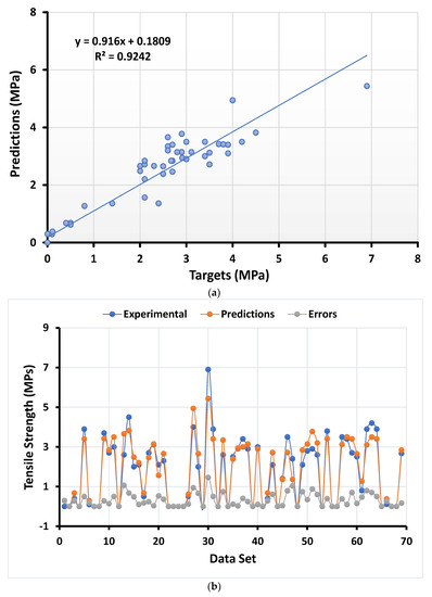 Numerical analyses representing the relationship between the predicted variables and targeted variables (a) along with their error distribution (b) for splitting tensile strength using DT.