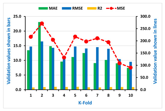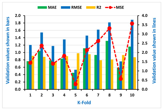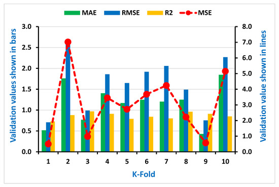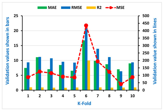 As seen in Figure 7, Figure 8, Figure 9 and Figure 10, the coefficient correlation (R2), mean square error (MSE), mean absolute error (MAE), and root mean square error (RMSE) were used to evaluate the k-fold cross-validation of each employed model against its output. The variation was also noticed in the outcomes of both ML algorithms used (DT and AdaBoost). The lower the number of errors in the AdaBoost model, the higher the coefficient correlation (R2) value, indicating a higher accuracy level than the decision tree. The information obtained from the analysis for both CS and STS used for k-fold cross-validation is listed in Table 3 and Table 4, respectively.