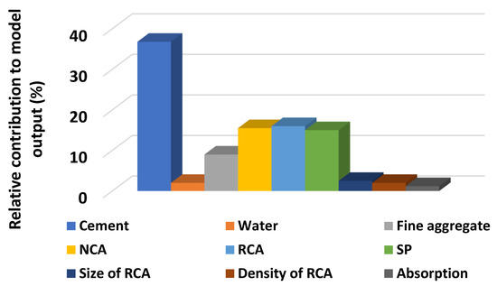 The input variables have a remarkable effect on the execution of the model’s outcome. The sensitivity analyses were done to investigate the effect of each variable on the anticipation of both STS and CS, as depicted in Figure 5. The cement significantly contributed (36.8%) towards the prediction of CS, while other parameters contributed the least towards the forecasting of concrete CS containing RCA, as shown in Figure 11. However, the contribution of parameters for predicting the STS can be seen in Figure 12. The significant contributions for the prediction of the STS of concrete were cement (41.2%) and natural coarse aggregate (NCA) (19%), while superplasticizers and RCA were the next highest contributors for the prediction of outcomes. The equations mentioned below were used to calculate the contribution of each parameter towards the model’s outcome.