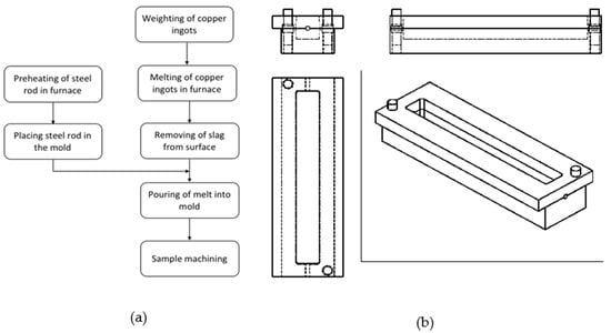 (a) Flowchart of foundry process used to prepare QMMC; (b) D2 steel mold used to make QMMC samples.