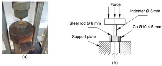 This test is performed to measure the matrix/fiber interface bonding strength between the copper matrix and the steel rod, which serves as reinforcement. A cylindrical sample (Ø 10 mm × 5 mm) was made from each Cu/Fe composite. The push-out test was carried out on a universal testing machine according to the ASTM F1820 standards, where the steel rod was mechanically pushed out of the matrix material (Figure 2).