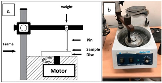 (a) Schematic view of the custom-built tribometer used in wear test; (b) photograph of the custom-built tribometer used in wear test.