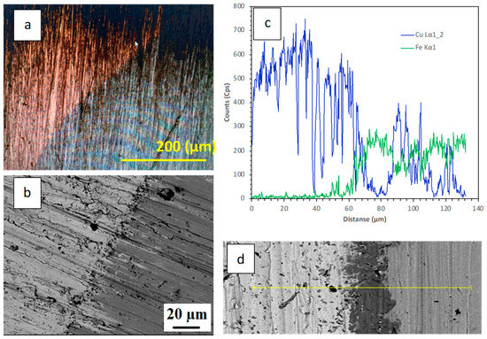 (a) Light microscopy image; (b) SEM image of a QMMC prepared by pouring molten copper onto the steel rod at 600 °C; (c,d) an EDS spectrum collected from the interface region and corresponding high magnification SEM image.