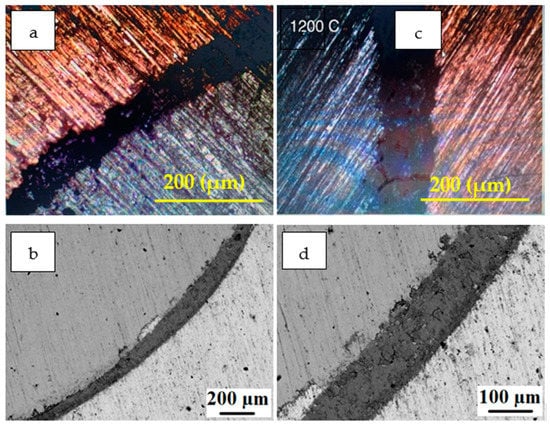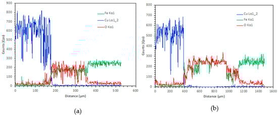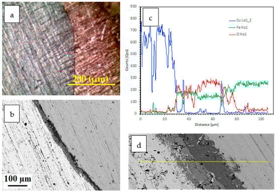 Figure 5, Figure 6 and Figure 7 show the microscopic results of the copper matrix reinforced with a preheated steel rod. Figure 5 presents an exemplary microstructure of QMMC prepared by pouring molten copper onto the steel rod at 600 °C. As revealed by optical and SEM images (Figure 5a,b,d), the interface has a discontinuous thin (about 11 μm) oxide layer containing micro-cracks and voids. This layer could hinder the bonding between the copper matrix and the steel rod [31]. The EDS profile collected from the interface region (Figure 5c) shows peaks of copper (Cu), iron (Fe), and oxygen (O), confirming the matrix-reinforcement bonding and the oxidation of the reinforcement’s surface. As seen in Figure 6, the thickness of the oxide layer increases steadily with temperature. The thickness of the layer increased from 66μm at 800 °C to about 135 μm at 1200 °C. The EDS spectra shown in Figure 7 did not show any evidence of the atomic diffusion at the interface. In other words, the EDS analysis demonstrates that the oxide layer acts as a barrier for the metallurgical bonding between the copper matrix and the steel rod.