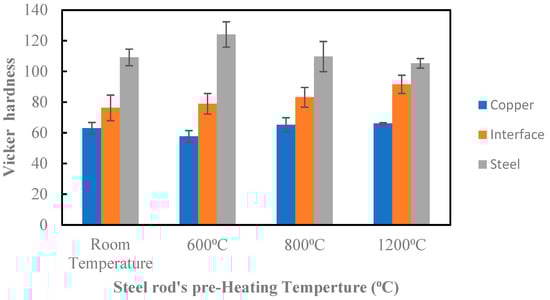 Vickers hardness of copper, interface, and steel rod at various preheated temperatures of steel rod.