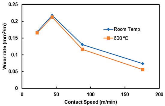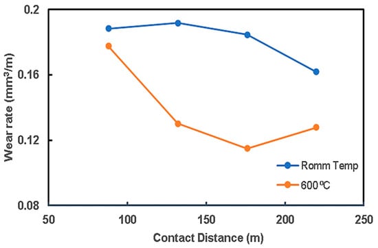 The previous results show that the preheating operation of steel rods to 800 °C and 1200 °C weakened the composites. Therefore, the wear analysis was restricted to two trials of preheating steel rods: room temperature and 600 °C, which gave the highest bonding strength. Figure 10 shows the relationship between the wear rate of the QMMC (at room temperature and with preheating the steel rod to 600 °C) and the contact speed with the abrasive disc. Preheating the steel rods to 600 °C improves the wear resistance of the composite, and this improvement is increased with the increase in the contact speed. This enhancement began with about 2% for a speed of 22 m/min to 24% at 176 m/min. Figure 11 shows the relationship between the wear rate of the same trials QMMC and the contact distance with the abrasive disc. The figure indicates that the preheating of the steel rods to 600 °C improves the wear rate resistance of the composite. This improvement is increased by increasing the contact distance to 176 m, then reduced to a smaller percentage. The enhancement began with about 6% at a contact distance of 88m, increased to 38% at 176m, and then reduced to 21% at 220 m. Figure 4c,d and Figure 5c,d show diffusion of iron within the copper and vice versa, while only Figure 5c (preheated 600 °C) showed the presence of O2 in the shared area between Cu and Fe. This means iron oxide was likely to be formed in this area. This could be the reason for improving the 600 °C trial over the room temperature trial.