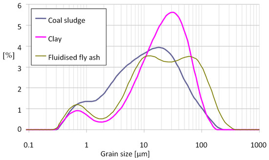 Lightweight aggregates is a definition for porous mineral aggregates with a density less than 2000 kg/m3 and a bulk density up to 1200 kg/m3 (according to PN-EN 13055:2016-07 [1]). Nowadays, lightweight aggregates can be classified into several groups depending on the type of raw materials used for production: a group of aggregates of natural origin from porous rocks, a group of aggregates of natural origin from thermally processed rocks, a group of artificial aggregates from thermally processed industrial wastes or by-products [2,3,4,5]. The lightweight aggregates produced from industrial by-products or waste materials account for an increasing contribution to building technologies, which fulfils the principles of the circular economy [6,7,8,9,10]. The properties of lightweight aggregates result from their porous structure, due to technological processes. It is mainly thermal processes that result in the formation of air holes enclosed in the structure of individual aggregate grains [11,12,13]. Depending on the raw material used for production, a product with varied properties and different applicability is formed [14,15,16,17]. Fluidized bed fly ash is a mass waste of the electric energy production process and is a serious problem due to the amount generated and moderate toxicity. Nowadays, a significant part of the tonnage is managed in various ways, e.g., to produce bricks [18] or for replacing Portland cement in concrete mixtures [19,20,21,22]. Post-mining residues are also a problem due to the enormous tonnage produced. For some time now, instead of simple storage, valuable raw materials have been recovered from them [23] or they have been used for various industrial purposes [24], including as additives to aggregates [25]. The sustainable management of both fluidized bed fly ash and post-mining residues is an important element of the circular materials economy which has become increasingly important and remains a subject of intense research across various disciplines [26,27,28].