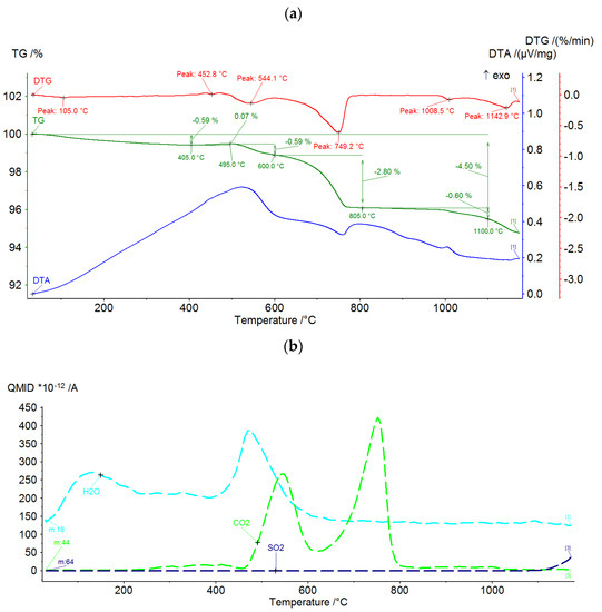 A Netzsch STA 449F3 Jupiter (Selb, Germany) was used to perform the DTA/DTG tests. The test was conducted in a synthetic air atmosphere at a flow rate of 40 mL/min. The heating rate was 15 °C/min. Feedstocks dried at 105 °C and ground to a grain size below 0.06 mm ranged from 85 to 95 mg. Thermal and chemical test results are shown in Figure 3, Figure 4 and Figure 5. Most of the thermal transformations were found to take place in all three components tested below 900 °C. In the case of the ash (PF) above 1000 °C, a progressive weight loss begins, overlapping approximately with the release of SO2. This probably involves oxidation of previously dehydrated sulphates. In the case of clay (GC), CO2 is emitted intensively before 800 °C. This is due to the decomposition of calcium carbonate. Sludge (MW) shows the intense emission of CO2 in the range of 300–700 °C, well overlapping with the increased level of DTA. This is undoubtedly related to the intensive oxidation of the carbon contained in the structure. It can be presumed that all three components will show significant physicochemical activity at temperatures above 1000 °C.