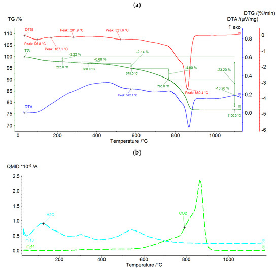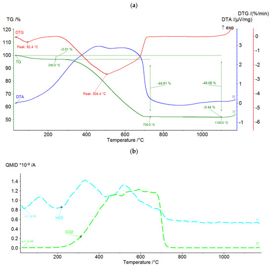 DTA/DTG curves (a) and gas analysis (b) during thermal treatment of clay GC.