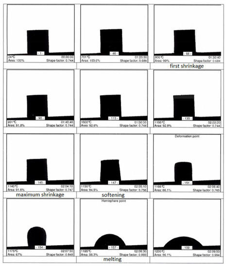 A high-temperature microscope made by Hesse Instruments (Osterode am Harz, Germany) was used. Measurements were carried out in an air atmosphere with a constant heating rate of 10 °C/min to a temperature of 1400 °C. Measurement results, in the form of photographs of the sample outlines at different stages of the test, are shown in Figure 6.