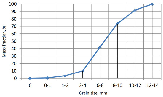 The particle size distribution of the raw components was determined with use of Mastersizer 2000 laser scanner made by Malvern Panalytical (Malvern, UK). The test was conducted in a wet medium, water. Test findings in the form of a mass fraction vs. grain size relationship are shown in Figure 2.
