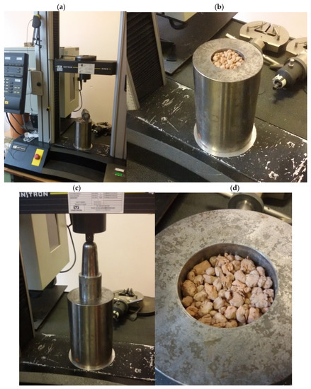 Therefore, the fraction below 4 mm and the fraction above 10 mm were removed from the samples prepared for the tests of separate aggregates. Aggregate crushing resistance testing consisted in the uniaxial compression of granules portion backfilled into a steel cylinder, using an INSTRON 4469 testing machine (Instron, Norwood, MA, USA). The compression was carried out up to a displacement of 12 mm (to be checked), while load–displacement correlations were recorded. The test stand and an example of a crushing test specimen are shown in Figure 12.