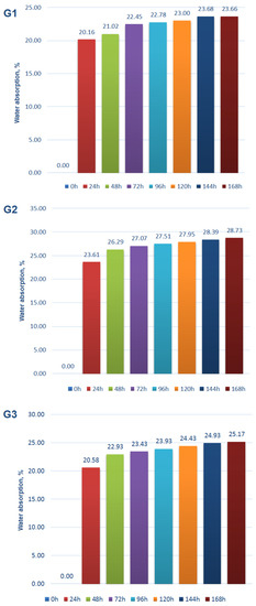 - Water absorption and freezing. First, samples of all three aggregates (G1, G2, G3) were seasoned in water for seven days (168 h). Water absorption of these samples was determined. After the water absorption measurements were completed, 10 four-hour freezing cycles at −10 °C followed by thawing at room temperature were carried out for each sample.