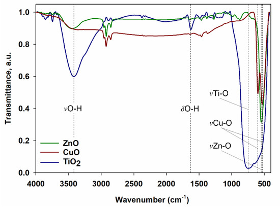 Fourier transform infrared spectroscopy was used to identify characteristic bands derived from the functional groups present in the structures of pristine components (ZnO, CuO and TiO2). In order to obtain FTIR spectra, a Vertex 70 spectrometer (Bruker GmbH, Mannheim, Germany) was used that was equipped with a sensitive MCT (mercury cadmium telluride) detector. It should be noted that this apparatus provides a very high scanning resolution of the samples, which exceeds 0.5 cm−1. FTIR analysis was performed in the wavenumber range of 4000–450 cm−1, and the number of scans was equal to 64. KBr pellets were prepared to perform the FTIR analysis of the used oxides. Their preparation consisted of mixing 250 mg of anhydrous KBr and approx. 1 mg of the analyzed substance, and then exposing this mixture to the pressure of 10 MPa for 10 min.