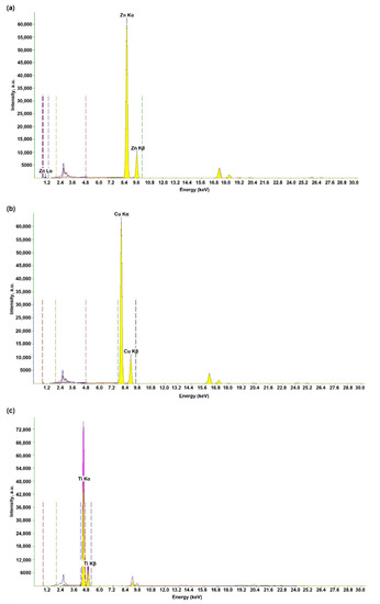 In the case of zinc oxide, characteristic peaks of Zn Lα, Zn Kα and Zn Kβ can be noticed, while the CuO spectrum shows the Cu Kα and Cu Kβ peaks that indicate copper(II) oxide. Titanium(IV) oxide was also confirmed by analyzing its EDXRF spectrum, as the characteristic peaks of Ti Kα and Ti Kβ were observed. The obtained peaks for the tested oxides are consistent with the literature data [43,44,45,46,47,48].