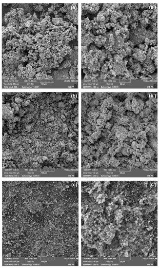 SEM images of ZnO (a,a’), CuO (b,b’) and TiO2 (c,c’) at two different magnifications.