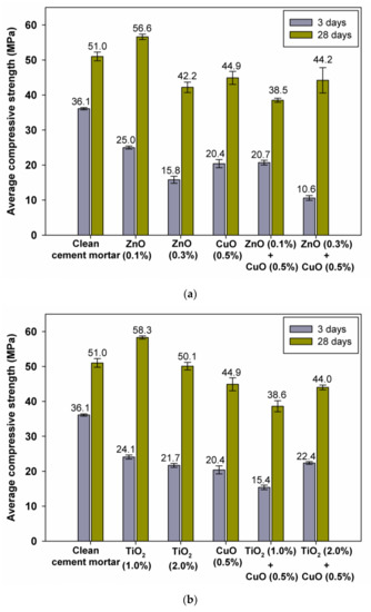 The compressive strength results are presented in Figure 5. Based on the conducted research, some trends can be observed. During the initial period of cement matrix hardening, up to day 3, we observed that zinc oxide at both weight percentages and copper(II) oxide affected the setting retardation, as manifested by lower strength gains compared to pure mortar. Similar relationships have also been reported for titanium(IV) oxide, with higher strength decreases. Despite the retarding effect of all oxides on cement binder setting during the first few days, an improvement in compressive strength after 28 days of curing was observed for both zinc and titanium(IV) oxides used in the amounts of 0.1 wt.% and 1 wt.%, respectively. This shows that these levels of oxides are the optimal values to guarantee strength gains throughout the test period.
