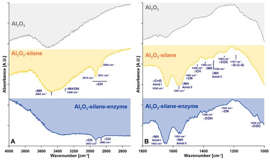 Additionally, on the spectrum of Al2O3, the characteristic bands from the enzyme, i.e., lipase, were visible. The observation of the vibrations of amide I, amide II, and amide III bonds in the structure of the enzyme at 1645, 1550, and 1250 cm−1 (Figure 1) was significant. The presence of these bands is said to prove efficient protein immobilization, as reported in the literature [4,5]. Furthermore, changes in the intensity of the signals generated by particular functional groups, i.e., hydroxyl and amine, indirectly proved the successful immobilization of the lipase on the ceramic surface.
