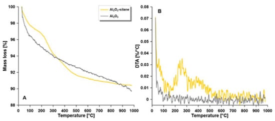 To determine the thermal stability of the modified ceramic powder, thermal gravimetric analysis was performed (Figure 2A) with the monitoring of the decomposition temperature (Td). The Td for the modified sample was equal to 260 °C, and the decomposition took place in the multistep process according to the derivative of the TGA plot (Figure 2B). TGA allowed us to not only determine the stability but also the effectiveness of the grafting process with the support of ATR–FTIR. The efficiency of the modification was established based on the number of hydroxyl groups available before and after modification (Equations (1) and (2)) [6,7]. The modification was characterized by a very high yield, equal to 96.2%.