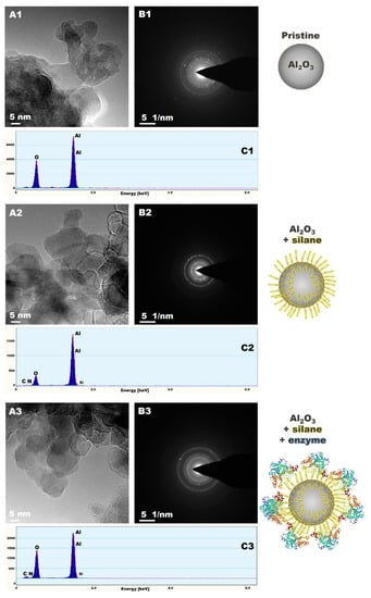 HR–TEM: bright field (A1–A3), SEAD images (B1–B3), and EDX spectra (C1–C3). A1,B1,C1: pristine Al2O3; A2,B2,C2: Al2O3 functionalized with silane; A3,B3,C3: Al2O3 functionalized with silane and enzymes.