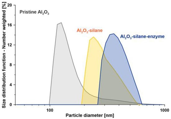 The diffraction laser scattering (DLS) and electrophoretic light scattering (ELS) measurements of the Al2O3 powder revealed that, as a consequence of the modification process, there was an increase in the hydrodynamic diameter from 125 ± 11 nm to 243 ± 15 nm. Further increment was found after attachment of the enzyme (Table 1, Figure 4). Due to the formation of a more branched structure in the course of the modification steps, a reduction in the electrophoretic mobility of ca. 20% was seen (Table 1). The tendency towards an agglomerate formation was expressed by the polydispersity index, which increased with the consecutive steps of the modification. For the pristine Al2O3, the polydispersity index was equal to 20%, whereas after silanization and enzyme immobilization it rose to 24% and 45%, respectively. All the modified samples were characterized by very high stability, confirmation of which was found in the distribution of the hydrodynamic diameter in water with a monodispersed population (Figure 4). Based on the ELS carried out in ultrapure water (pH = 5.8), it was demonstrated that the surface charge was influenced by the modification. The fact that after the silane attachment, the amine terminal groups were easily available might have influenced the zeta potential. The value was slightly reduced from 42.9 ± 2.2 mV to 35.2 ± 1.8 mV when comparing the pristine sample with the sample modified with silane. Nevertheless, the enzyme attachment increased the zeta potential to 39.6 ± 1.3 mV. Furthermore, the decline in electrophoretic mobility should be linked to the high level of enzyme loading on the surface. After enzyme addition, the surface becomes less movable and uniform. The measured value of the pristine Al2O3 was in good agreement with the literature data [41]. It should be pointed out that zeta potential is subjected to particle size [42]. Particles in an aqueous solution, in the size range up to 1 μm, classically carry an electric charge and possess the tendency to approach one another due to the Brownian movement rule [43]. Based on the Derjaguin–Landau–Verwey–Overbeek (DLVO) concept [44], when the kinetic energy of the colliding particles is sufficient to overwhelm the energetic barrier from the electrostatic repulsive force, the van der Waals attractive force succeeds and lets the particles adhere strongly together. The presented model is valid for coagulation or flocculation, thus raising the size of colloidal aggregates [45]. In water, the stability of particles of submicron size, as well as nanoparticles, is related to electrostatic interactions or double-layer repulsive forces if only DLVO forces are present. It should be pointed out that electrostatic interactions or double-layer repulsive forces are much more intense than van der Waals attractive forces [46]. For the range of non-DLVO attractive forces, such as hydrophobic forces, connection by patch charging, adsorbed additives, and hydrogen bonding of the functional groups of adsorbed additives dominate [47]. The cause of the substantial difference between zeta potential for the pristine, functionalized, and immobilized materials was the addition of first the linkers and then the enzymes, as well as the moderation of the hydrophilicity/hydrophobicity features.