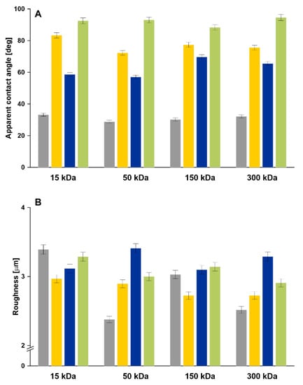 Differences in apparent contact angle (A) and roughness (B) of the investigated membranes: pristine samples, samples modified with silane, samples immobilized with the enzyme, and samples applied in the process.