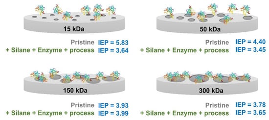 Relation between surface morphology (MWCOs) and possible location of grafting molecules and enzymes and the changes in isoelectric point (IEP) of the surface.