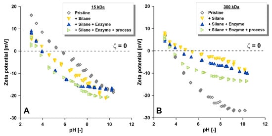 Zeta potential in the pH range of 3–10. Impact of all modification steps for the membranes with the smallest, 15 kDa (A), and the biggest, 300 kDa (B), pore size (MWCO).