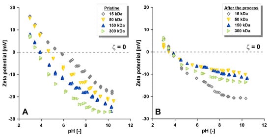 To understand in detail the alterations to the hybrid materials’ features, zeta potential analyses were performed to study the affinity between the silane, enzyme, and ceramic support (Figure 6). The zeta potential (ζ) measurements with potential streaming analysis were informative and shed light on the subtle differentiation in the surface charge after the modifications (Figure 6, Figure 7 and Figure 8). First of all, the morphology of the ceramic support has a substantial influence on the surface charge (Figure 6 and Figure 7). The membranes with a smaller pore size (Figure 6 and Figure 8A) possessed less negative charge on their surfaces. More negative values were observed gradually as the pore size of the ceramics increased. Moreover, the isoelectric points (IEP) for the pristine supports were reduced as the pore size of the membrane was increased. The 15 kDa membrane was characterized by the IEP 5.85, and the membranes with bigger pores possessed the following values of IEP: 4.40 (50 kDa), 3.93 (150 kDa), and 3.78 (300 kDa) (Figure 6). In the case of the membranes modified with silanes, the surface charge was strongly influenced by the pore size. In the case of the 15 kDa membrane, a slight reduction in the zeta potential values was observed (Figure 7A). However, for the sample with the biggest pores, i.e., 300 kDa, an opposite tendency was noticed. In this particular case, the pristine material was characterized by a highly negative charge on the surface. Nevertheless, a significant enhancement in the positive charge as an effect of the silanization process was found. The most significant impact was seen in the base range of the pH (Figure 7B). On the other hand, independently in the membrane morphology after bioconjugation and the application of the membrane in the enzymatic process, an improvement in the negative character of the surfaces was noticed. Such behavior is typical for bioconjugates and is considered as a fingerprint of protein settlement, leading to a decrease in the overall electrostatic potential [51,52]. It should be pointed out that the membrane supports were selected in order to provide the opportunity to study the impact of membrane modification. For this reason, the material with the smallest pore size was chosen to ensure the impossibility of the entrance of the enzyme, with a pore size of ca. 20 kDa. Confirmation of the abovementioned behavior can be seen in the changes to the surface charge of the materials modified and applied in the enzymatic process (Figure 8B). The zeta potentials for the 15 kDa material were much smaller than for the other samples, where no significant differences were observable. This was related to the fact that for the 50 kDa, 150 kDa, and 300 kDa membranes, the enzyme and silane molecules could be located inside the pores, and their access to the surface was limited.