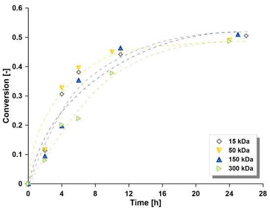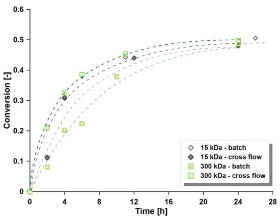 To better examine this effect, analogous transesterification processes were performed in a cross-flow membrane reactor for the membranes of the extreme cut-offs: 300 and 15 kDa (Figure 9). The results for these processes compared to the stirred-tank system are shown in the Figure 10 and Table 4.