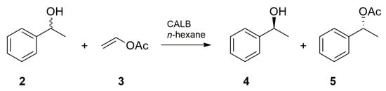 Scheme of the asymmetric transesterification of (R,S)-1-phenylethanol with vinyl acetate.