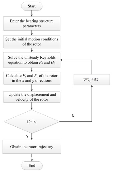 Then the pressure of the next time step is calculated by substituting the new bearing eccentricity, attitude angle, the gas film thickness and pressure distribution of the previous step into formulas (4)–(9). The calculation process is shown in Figure 2. The unsteady pressure distribution and the spindle center in the time domain are obtained by iterating the process, and the structural parameters of the bearing are shown in Table 1.