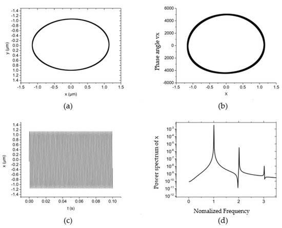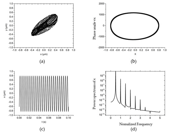 The non-linear dynamic behavior of the system is shown in Figure 3 when the rotating speed is 30,000 r/min, the system external load (vertical direction) is 10 N, the rotor mass is 10 g and the unbalanced mass is 0.01 g. From Figure 3a,b, it can be seen that the trajectory and phase angle of the rotor are both an ellipse under this working condition. Meanwhile, the rotor is characterized as a period vibration, as shown in the time domain vibration diagram of Figure 3c,d. Figure 3d shows that under this kind of motion characteristics, the main vibration energy of the rotor comes from the rotation speed vibration of the rotor, and the peak energy density of the system is also near the rotation frequency. The vibration of the system at higher frequencies is also a multiple of the rotation frequency.