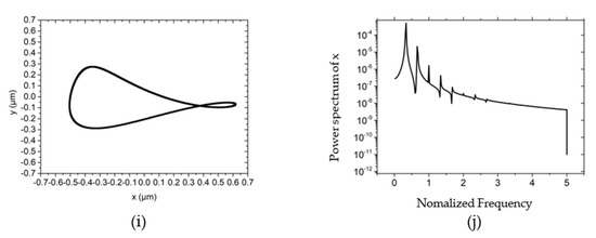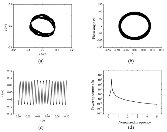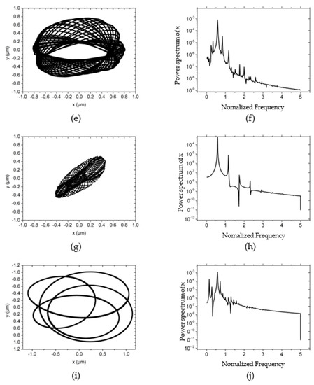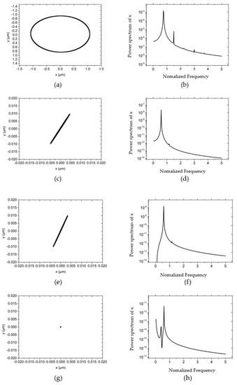 On the basis of the numerical model in Section 2, the typical non-linear dynamic behaviors of the hybrid air bearing-rotor system are analyzed in Figure 3, Figure 4, Figure 5, Figure 6, Figure 7, Figure 8, Figure 9 and Figure 10 in terms of rotor center trajectory, phase angle and time-domain vibration and power spectral density. Furthermore, the influences of the rotor mass, load force, rotating speed and unbalanced mass on the non-linear behavior of the hybrid air bearing-rotor system are studied and demonstrated using non-linear analysis.