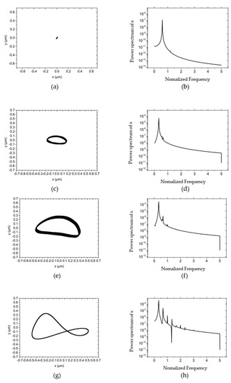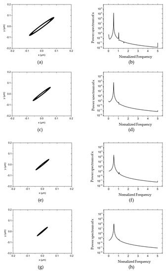 When the rotating speed is 50,000 r/min, the rotor mass is 90 g and the unbalanced mass is 0.01 g, the influence of different external loads on the non-linear dynamics of the hybrid air bearing-rotor system is shown in Figure 6. By comparing the rotor center trajectory under different external loads in Figure 6, it can be found that as the load increases, the size of the semi-major axis of the elliptical motion trajectory of the rotor gradually decreases, but the basic motion trajectory is the same as the characteristic vibration in Figure 5. Figure 6b,d,f,h also confirms the gradual decrease of the peak power spectral density of the half-speed whirl in the x-direction. The existence of the load increases the eccentricity of the hybrid air bearing. At large eccentricity, the damping of the system is enhanced, which can effectively limit the amplitude of the rotor movement.